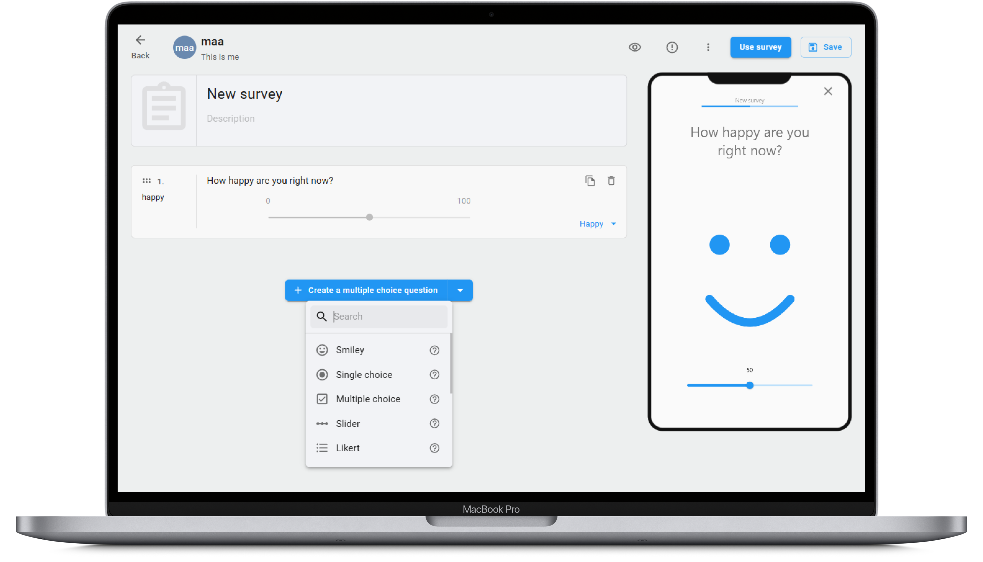 Use sliders, multiple choice items, open questions, smileys and other assessment types.