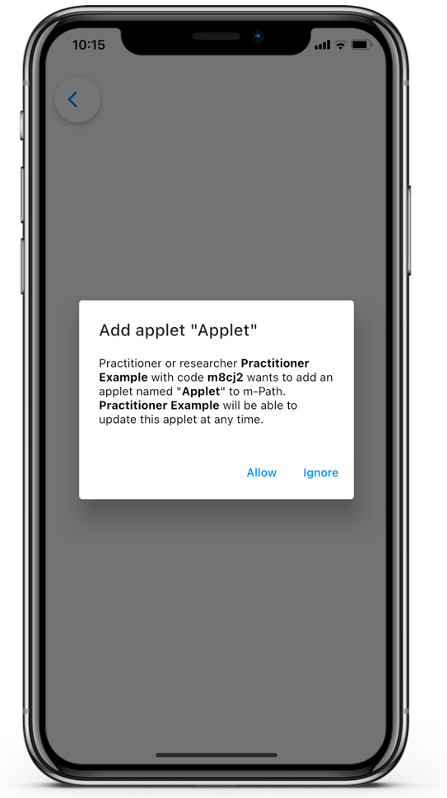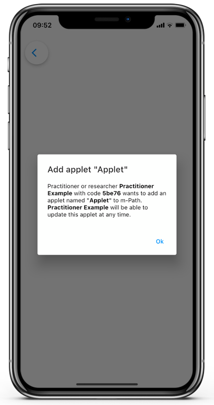 When a practitioner adds an applet to your account, you will receive the following notification on your home page. To allow the practitioner to add the applet, tap on Allow or Ok.