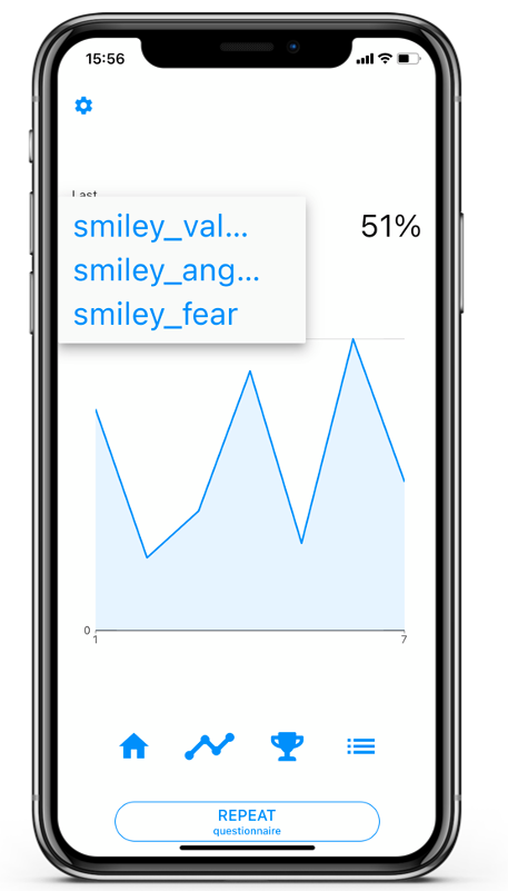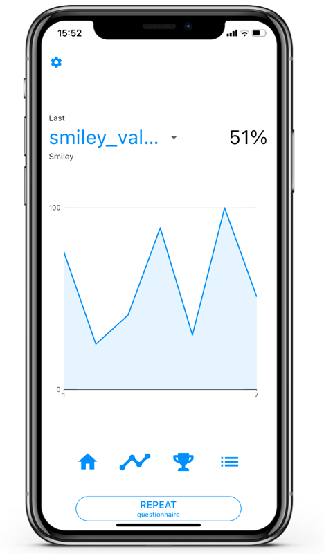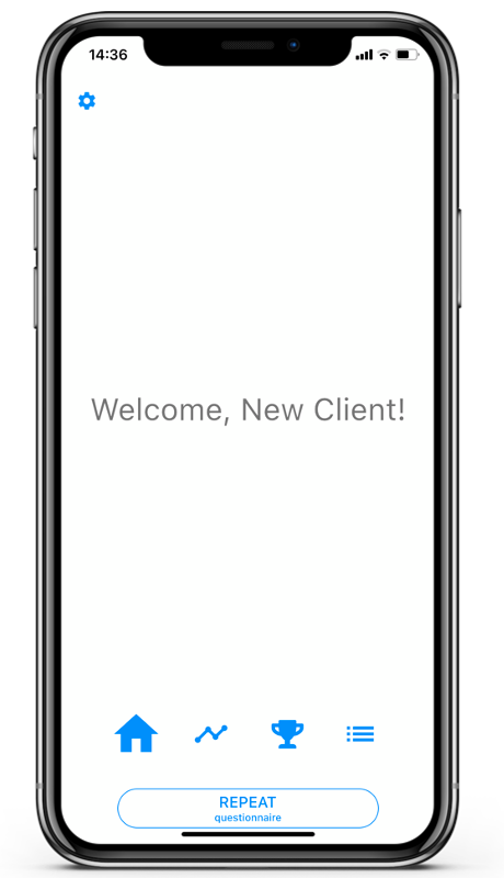 • State 3: The button reads ‘REPEAT questionnaire’. The client has filled in all questionnaires. If the client taps on the button he will be able to repeat the last questionnaire he or she filled in. Of course, clients will not be able to repeat questionnaires that have been given the ‘one time answer‘ mark.