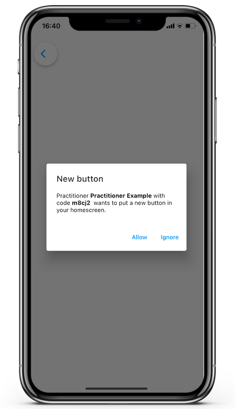 When a practitioner adds a home button, you will receive the following notification on your home page. To allow the practitioner to add the home button, tap on Allow.