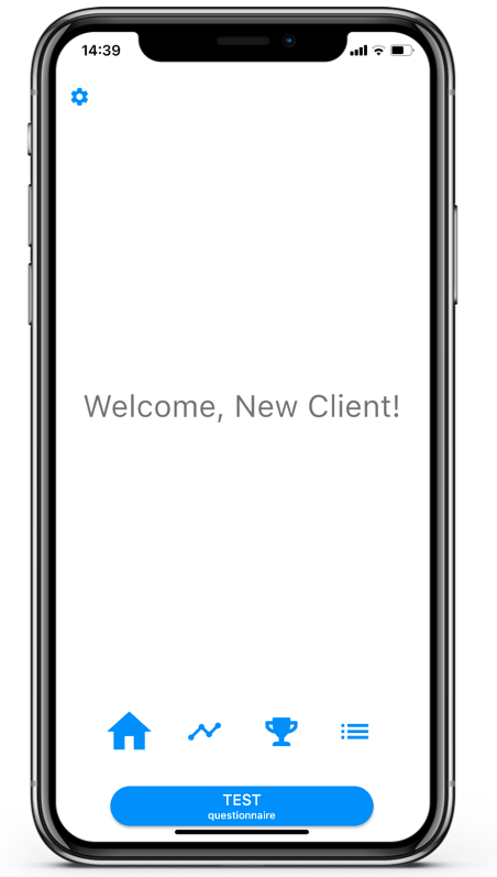 • State 1: The button reads ‘TEST questionnaire’. The client is new in the app and has not yet received or answered any questionnaires. When the client clicks on the button he or she can answer a test or play questionnaire.