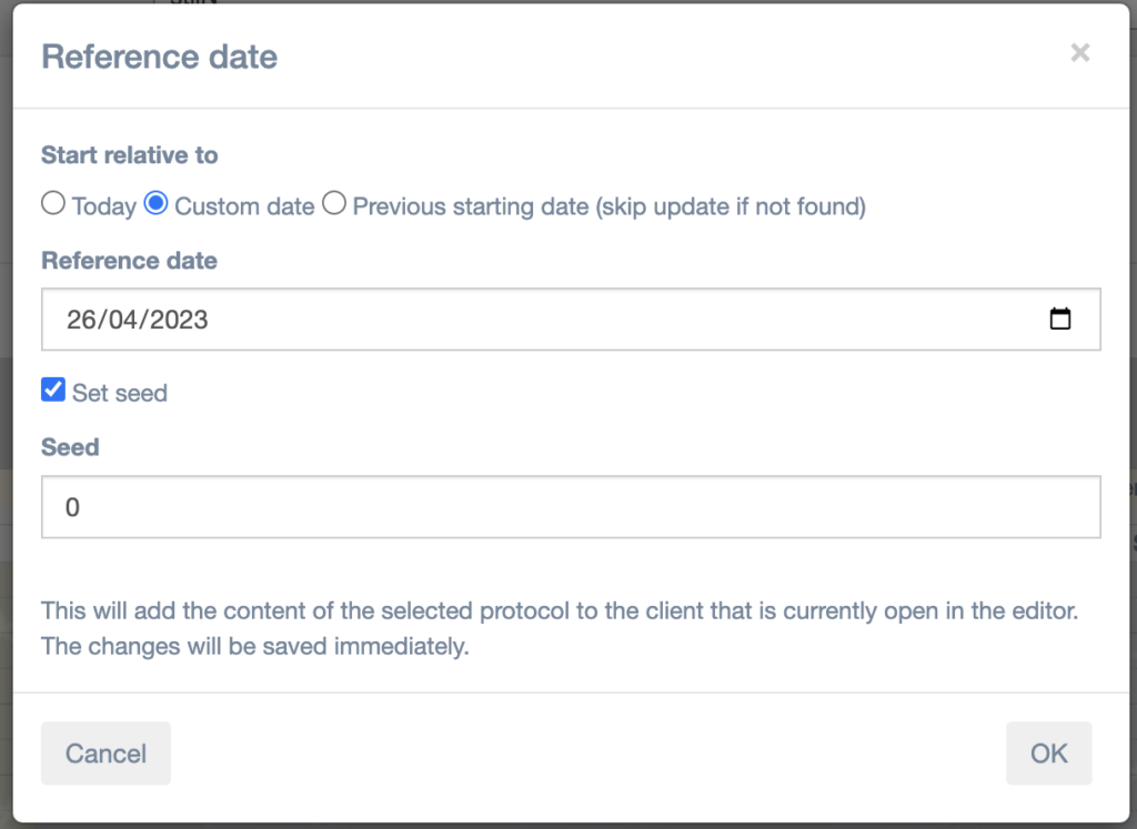 • Previous starting date: If you want to reapply the protocol for someone but use the previously used starting date, choose this.