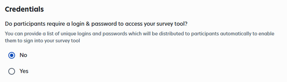 Participants do not need a login or password to join your study, which is one of the advantages of using m-Path. Therefore, when Prolific asks about requiring a login, you can simply select “No.”