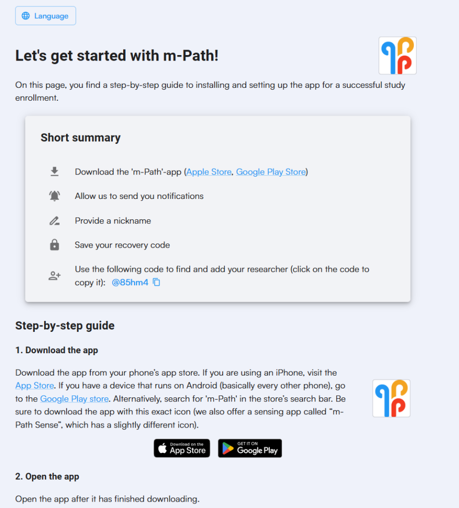 When participants join your study, they first need to go to a special onboarding page. This page guides them through downloading the m-Path app on their smartphones and links them to your study as a researcher. It ensures that each participant is correctly connected to you and your research project.