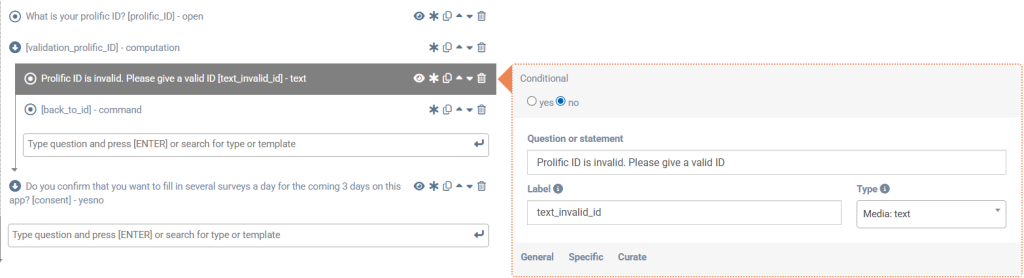 Then add a conditional text for when the result is “no,” for example: “Prolific ID is invalid. Please give a valid ID.”