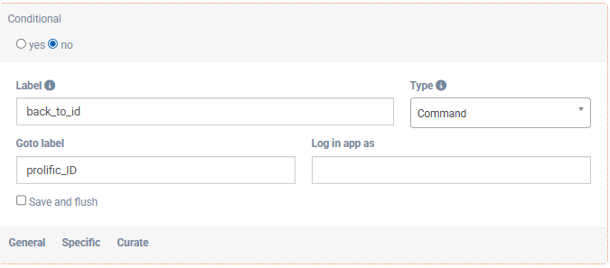 Finally, add a conditional command where the Goto label is the label of your Prolific ID question to send the participant back to the Prolific ID question. This ensures that participants cannot continue with an invalid ID, avoiding issues with payment later.