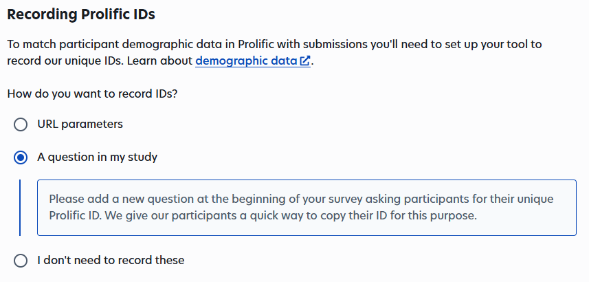 For recording Prolific IDs choose “A question in my study”. In your intake survey, be sure to include a question asking participants for their Prolific ID, because you will need this information to track who earned which bonus payments. Scroll up for a step-by-step explanation on how to set this up and add validation.