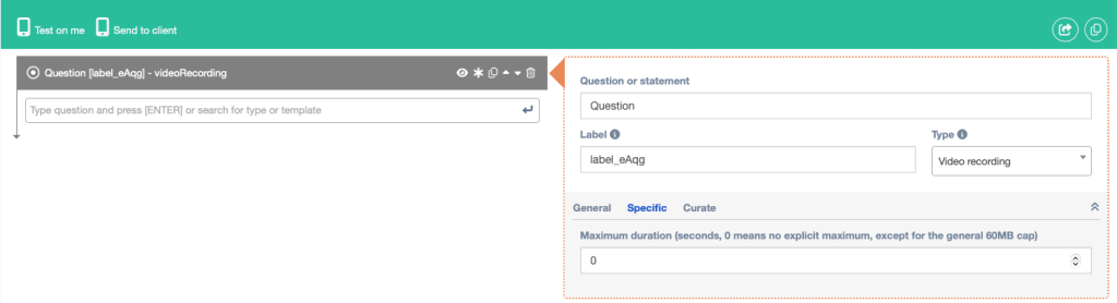 The video recording question type is used to let participants record a small video of themselves or their surroundings. A default cap of 60MB is enforced to limit the amount the participants need to upload to servers. This 60MB is approximately a 4 minute video. But this could be different for every device and camera.